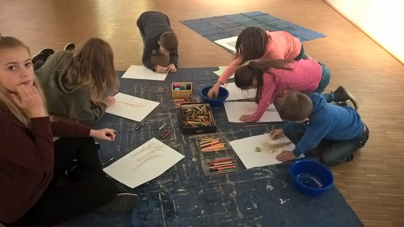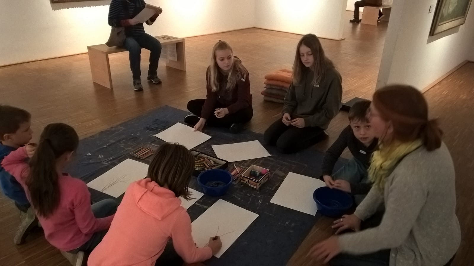 Frau Greil, eine Museumspädagogin, führte uns zu drei ausgewählten Bildern mit unterschiedlichen Baummotiven aus der Dachauer Künstlerkolonie. Dort wurden sie angehalten, genau hin zu schauen, was alles auf dem Bild zu entdecken ist. Die Kinder fanden ganz Erstaunliches und stellten auch Unterschiede in der Malweise fest. Anschließend durften sie selbst – auf dem Boden liegend im Eingangsbereich des Museums -zu den (Aquarell)-Farben greifen und ein eigenes Baumbild gestalten.