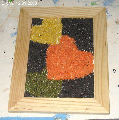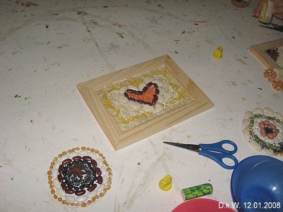 Nach einer kurzen Einführung konnte es losgehen. Wir begannen mit einfachen Formen. Aus Pappendeckel wurden Kreise und Herzen zweifach ausgeschnitten, damit wir sie später, mit einem Aufhänger dazwischen, gegeneinander kleben konnten. Mit Ponal oder Uhu klebten wir dann mit den bereitliegenden Körnern selbsterdachte Muster auf. Schon nach kurzer Zeit waren die ersten wunderschönen Mandalas fertig. Nun begannen die meisten mit der schwierigeren Aufgabe, nämlich einen kleinen Holzbilderrahmen mit einem schönen Muster oder mit einem Bildchen auszufüllen. Es überrascht uns immer wieder wie geschickt und kreativ die Kinder ihre Ideen umsetzen. Mit berechtigtem Stolz konnten sie ihre "Kunstwerke" nach Hause tragen.