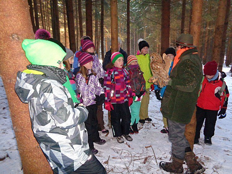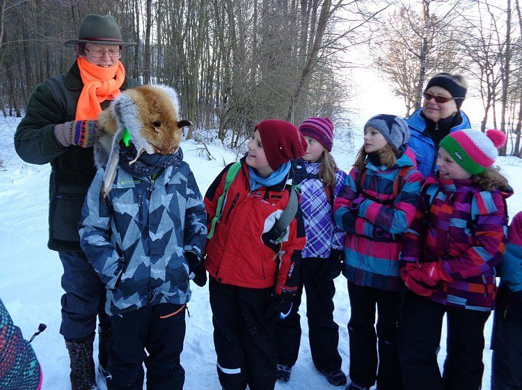 Wir hatten Glück mit dem Wetter. Es war zwar sehr kalt, aber die Sonne schien, Wiesen und Äcker waren verschneit und auch im Wald lag eine recht dicke Schneeschicht. Frau Karcher führte uns auf einem Feldweg zu einem Wald, der sich bis nach Mariabrunn hinzieht. Dabei konnten wir schon viele verschiedene Tierspuren auf den verschneiten Wiesenflächen entdecken. Am Waldrand angekommen, erzählte uns Frau Karcher sehr anschaulich vom Leben der Waldtiere allgemein und ganz besonders jetzt in der Winterszeit. Dann sollten die Kinder allein, oder in einer Gruppe, durch ein bestimmtes Waldstück streifen und dabei die "Waldtiere" entdecken und zählen, die hier von Frau Karcher ein "Zuhause" gefunden hatten. Begeistert machten sich alle Waldgeister auf die Suche. Sie mussten genau hinschauen, auf den Boden, hinter die Bäume, auf die Zweige, unter Wurzeln und in Bodenmulden. Es dauerte nicht allzu lange, dann hatten die Waldgeister alle zehn Tiere gefunden: einen Fuchs, ein junges Wildschwein, einen Feldhasen, einen Waldkauz, ein Hermelin, ein Eichhörnchen, einen Bussard, einen Baummarder, ein Hirschgeweih und das Gehörn eines Rehbockes. Die wunderschönen Tierpräparate sahen in ihren Verstecken wie lebendig aus. So nahe waren die Kinder noch keinem dieser Waldtiere gekommen. Gemeinsam gingen wir von Tier zu Tier zurück, wobei uns Frau Karcher von der Lebensweise und den Besonderheiten der Tiere berichtete. Die Waldgeister durften die Tiere auch anfassen und das Fell befühlen, die Zähne und die Krallen untersuchen. Anschließend wanderten wir in einem Bogen durch den Wald und ließen uns die verschiedenen Trittspuren der Tiere im Schnee erklären.