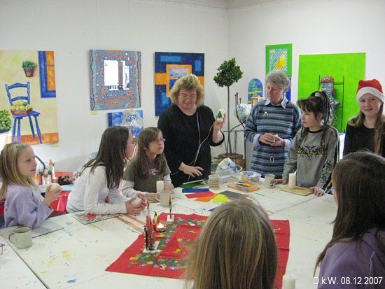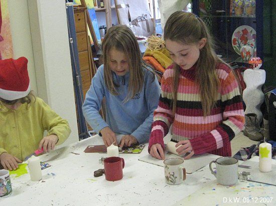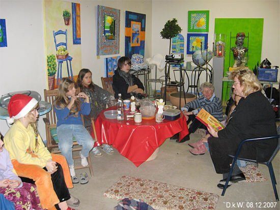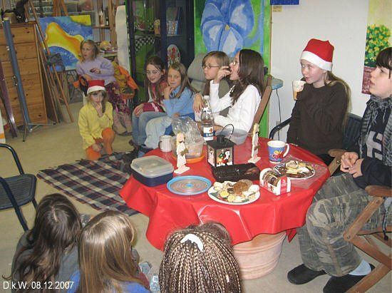 Herr Röhrer hatte während dessen schon den Kinderpunsch vorbereitet und ein köstlicher Duft zog durchs Atelier. Jetzt hatten wir Zeit, uns um den runden Adventstisch zu setzen, das große Licht zu löschen, leise Weihnachtsmusik zu hören, Plätzchen zu knabbern und den Weihnachtsgeschichten zuzuhören, die die großen "Waldgeister" vorbereitet hatten.