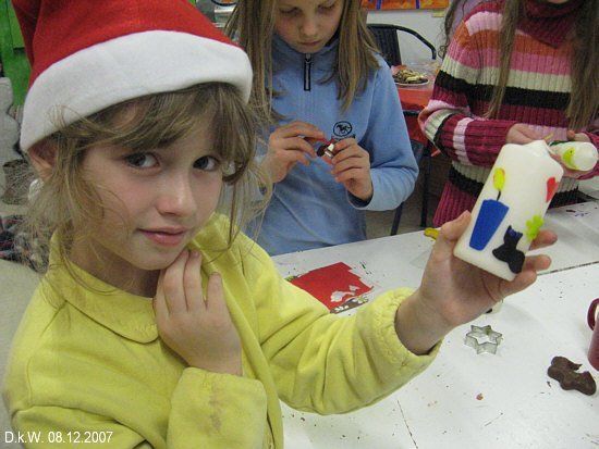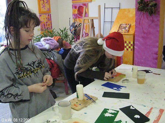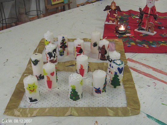 Nun konnten wir unsere heutige Bastelarbeit beginnen: Wir wollten helle Stumpenkerzen mit Knetwachs verzieren. Größere Motive konnten die Kinder mit Förmchen aus den Wachsplatten ausstechen, kleinere Einzelheiten wurden geknetet oder mit einem Messer ausgeschnitten. Sehr geschickt und mit vielen Ideen entstanden bald wunderschöne, fantasievolle Weihnachtskerzen.