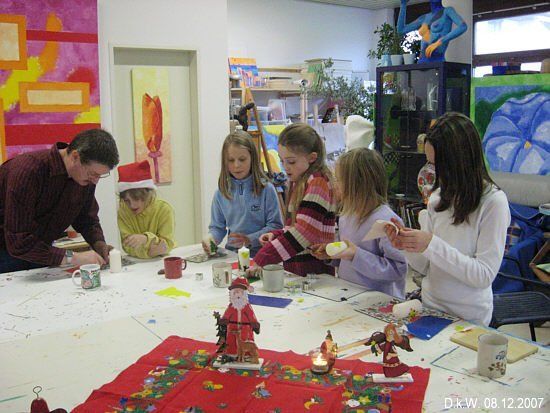Ganz pünktlich kamen die Kinder an diesem Samstag Nachmittag in den weihnachtlich geschmückten Atelierraum. Sie waren schon sehr gespannt, wie ihre Tonanhänger vom letzten Treffen gebrannt aussehen würden. Stolz betrachteten die Kinder ihre Anhänger: Schön sahen sie aus! Der rötliche Ton wirkte sehr dekorativ, so dass wir beschlossen, auf Farbe und Goldbemalung zu verzichten. Ein hübsches Bändchen zum Aufhängen musste noch eingeknüpft werden, dann waren die Anhänger fertig.