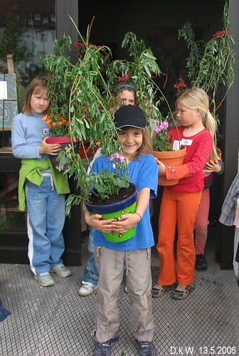 Am 13.Mai haben die Kinder die Blumentöpfe bepflanzt, dazu bekam jedes Kind eine Pflanze (Blume) vom Gartenbauverein geschenkt. Weidenruten, die als Rankhilfen für die gesäten Wicken und Kapuzienerkresse dienen sollen, ergänzten die Pflanzung.