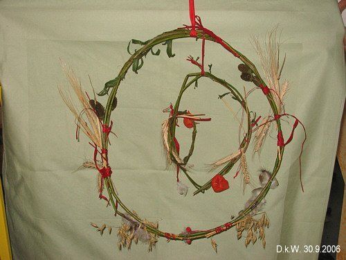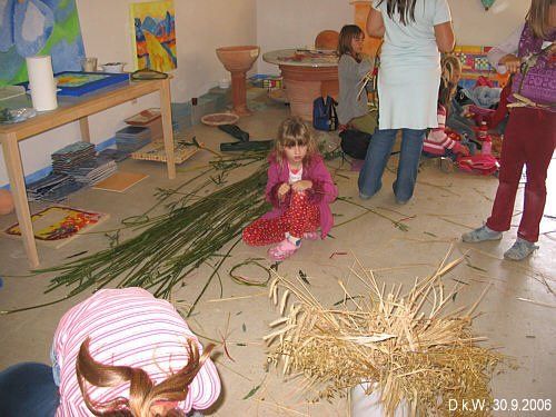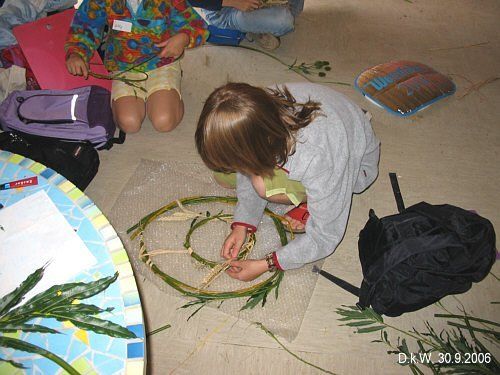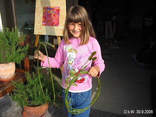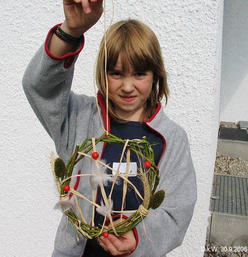 Am 30. September trafen sich die Waldgeister zum ersten Mal wieder nach der Ferienpause. Der Samstag lag genau richtig vor dem Erntedankfest und so konnten unsere entstandenen Herbstkränze gleich als Hausschmuck verwendet werden. Dünne Weidenruten bogen und flochten die Kinder zu kreisförmigen Gebilden, die sie mit Getreideähren, Lampionblumen, dekorativen Samenständen von Gartenblumen, kleinen Federn, Bast und bunten Bändern verzierten. Es wurden wunderschöne, phantasievolle und richtig künstlerisch gestaltete Kränze.