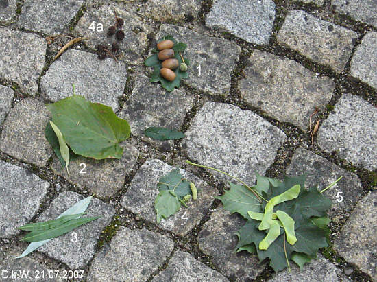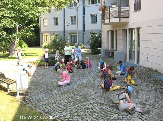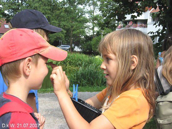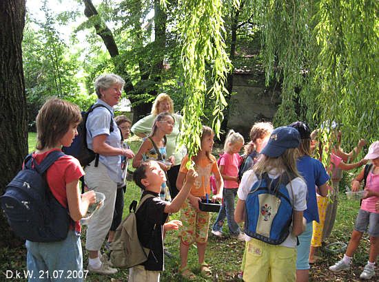 Mächtige 70-80 jährige Linden, einige etwa hundertjährige Eichen und eine riesige, zeltförmige Trauerweide wurden so, neben anderen Bäumen, untersucht. Sehr eifrig und interessiert beteiligten sich die Kinder an diesem Rundgang, der mit einem Blätter- und Früchtememory abgeschlossen wurde.