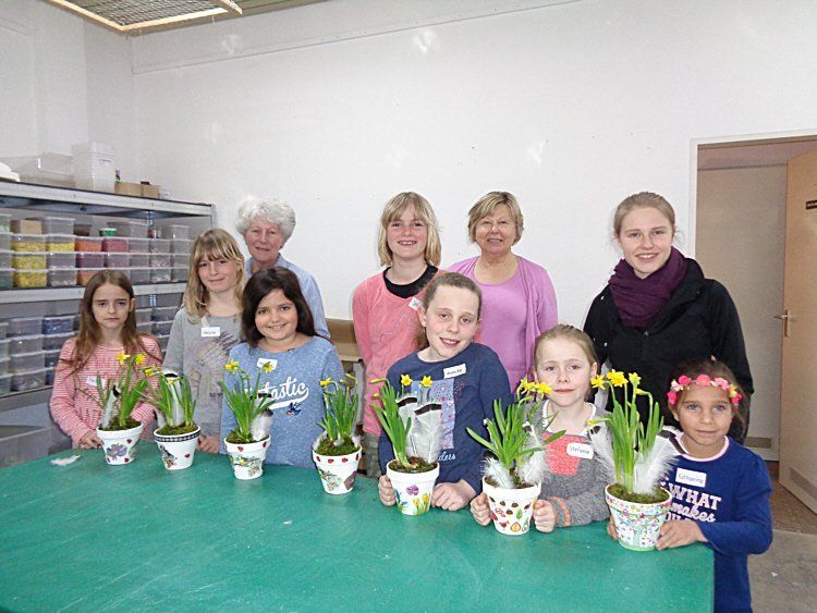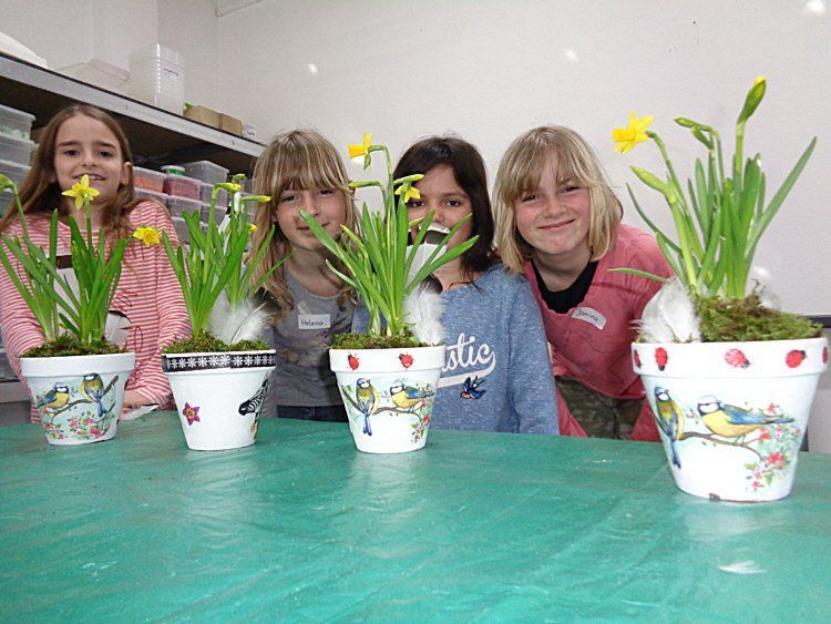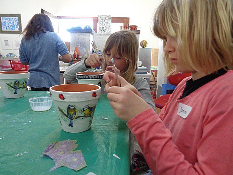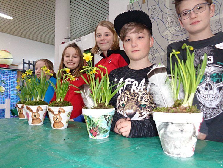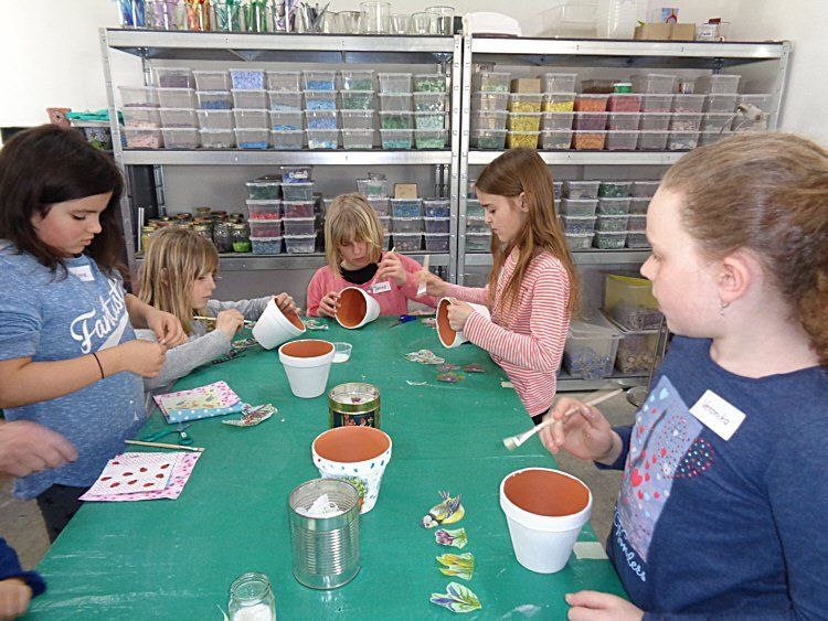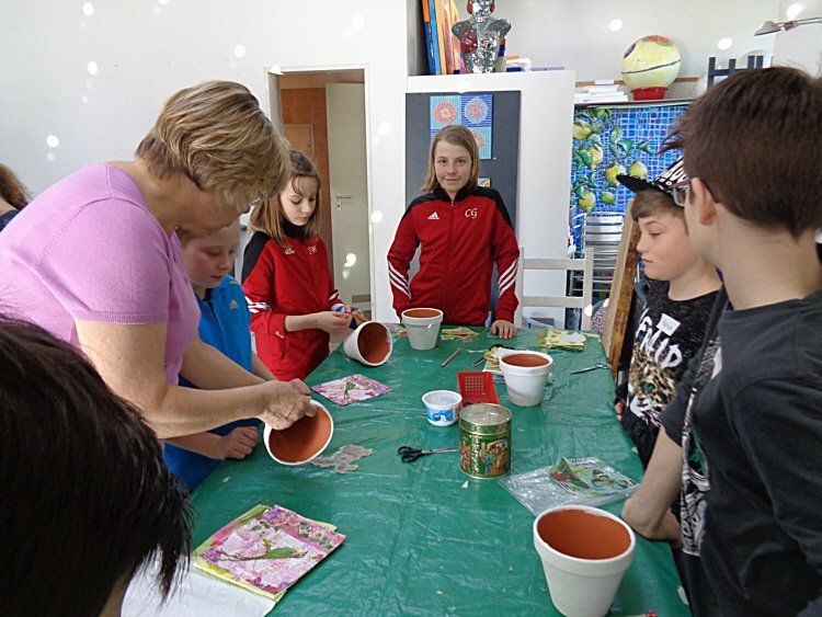 Die Waldgeister gestalten Blumentöpfe mit Serviettentechnik am 11.3.2017