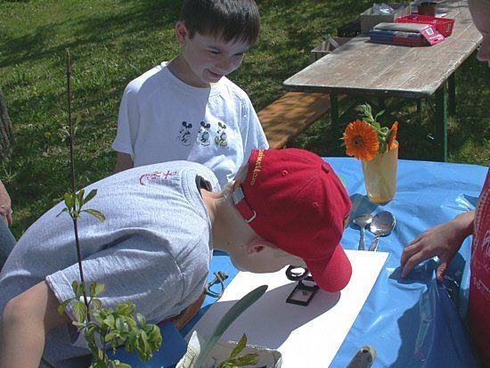 Kinder betrachten den Ringelblumensamen unter der Lupe