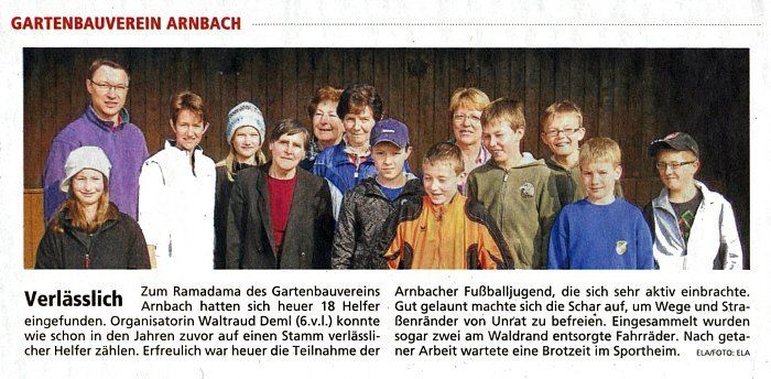 Beim Ramadama am 24.03.2012 des Gartenbauvereins Schwabhausen, mit den Ortsteilen Arnbach, Rumeltshausen und Stetten, waren dieses Jahr erstmals die Sportjugend und der TSV Schwabhausen und Arnbach eingeladen, sich zu beteiligen.